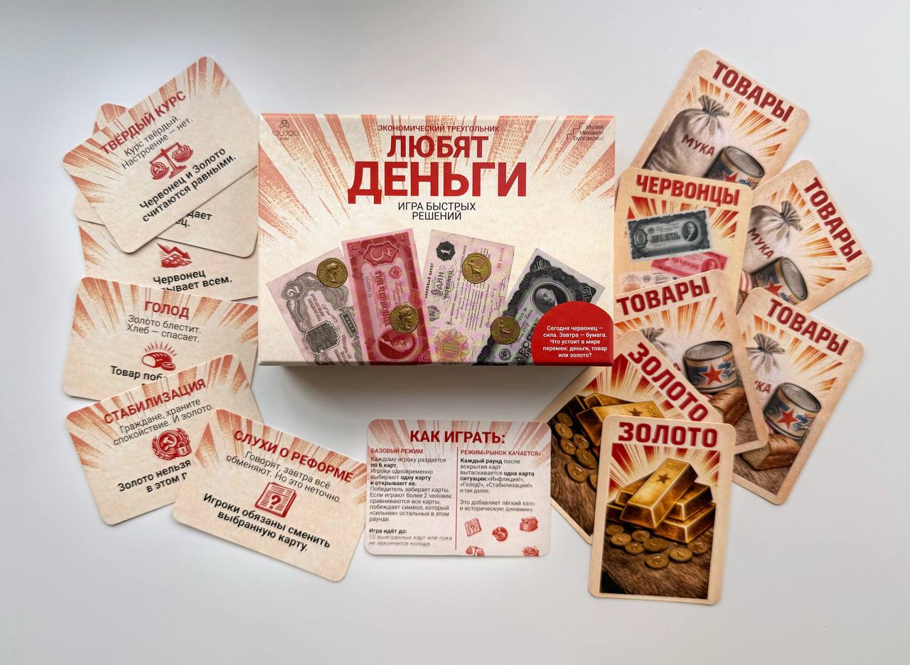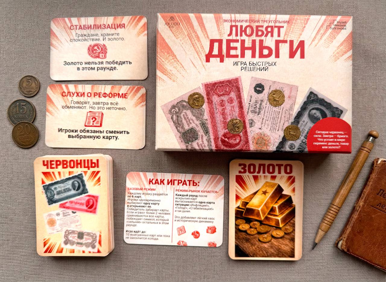 Настольная игра «Любят деньги» к выставке «Люди как люди. Любят деньги» в Историческом музее от Музей Михаила Булгакова (Москва) и бренда JOUJOU kids. В её основе — простая и знакомая механика, напоминающая классическую игру «камень, ножницы, бумага», но переосмысленная через мир советской экономики.