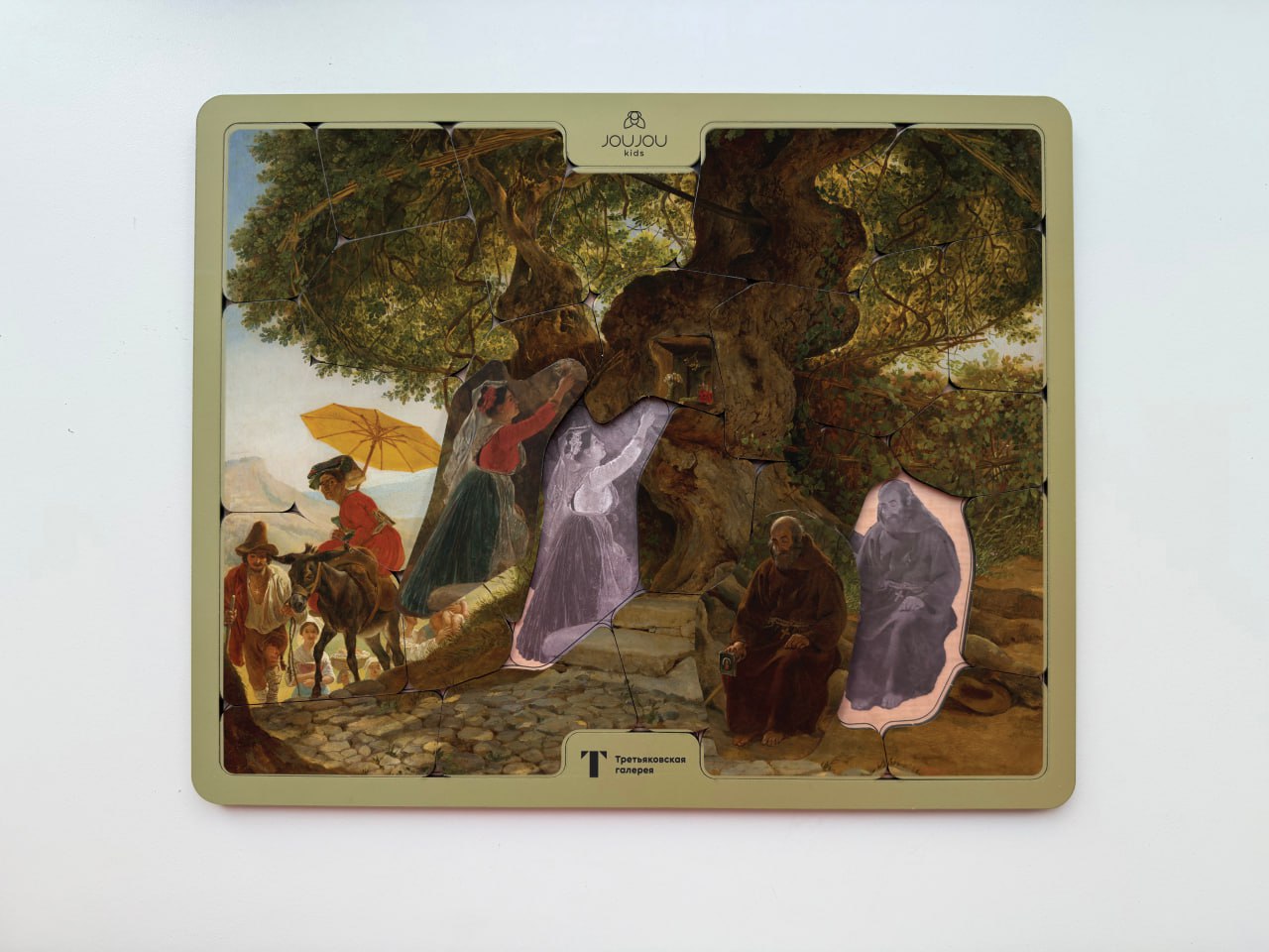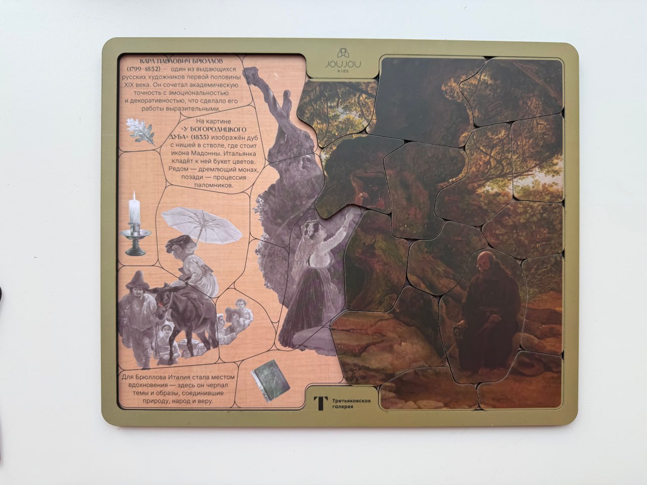 Первый слой пазла — художественная реконструкция самого полотна, а второй — раскрывает скрытые смыслы: что означают фигуры, почему художник обратился к этой теме и как природа превращается в сакральное пространство.